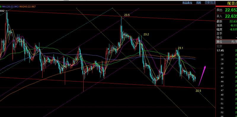 白银方面:走势比黄金弱些,不过一旦金价继续上攻,白银很快会大阳补涨;从图中通道看,下轨支撑留意22.5,刚好也是日线中轨一线,阻力23.1,先看此区间的运行得失,能突破23.1,则可以逐步看上轨23.5;