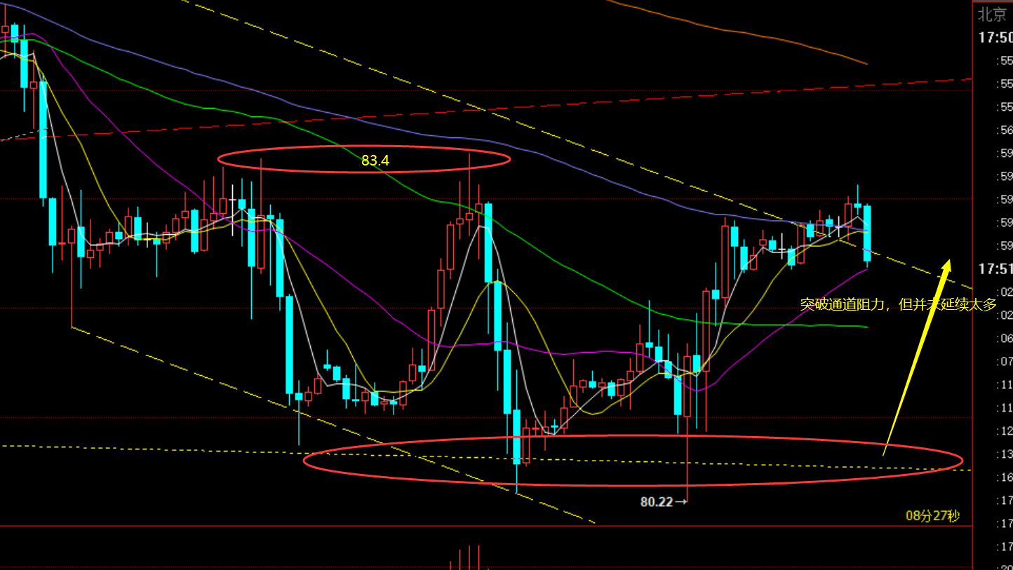 原油方面:日线10日阻力下移83.4,刚好是前几日的双顶压力位,隔夜探底拉升,今日先震荡续涨,突破了黄色通道上轨,但并未延续太多,此时大阴又回归通道内,就有概率继续底部过山车反复;当前先留意82.2和81.8,属于凌晨支撑点和顶底支撑点,想要延续隔夜的拉升,这里是不能被失守了,不然就回到83-80区间内的反复扫荡;总体上这几日坚持于扫荡通道下轨 80上方逢低看涨为主,因为倾向于日线级别震荡反复酝酿后,再后市展开一轮强势单边拉升;