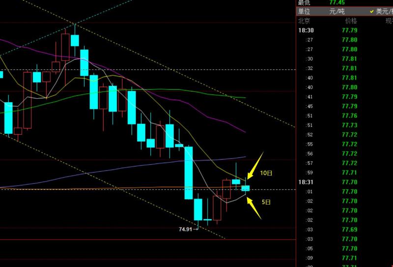 原油方面:日线昨日收报长上影小阴,收盘并未站上关键10均线,则还处于下调中,不过5均线有所拐头向上支撑于77.5一线, 10日下移78.5,今日其实就看 5日和10日之间的争夺;向上突破站上10日,则结束前面的弱势下跌,转强上攻;反之,向下失守10日,就可能又打回上周底部区间;