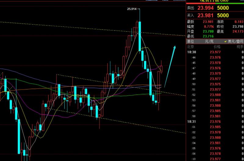 第二,白银方面: 价格也只是刺破22.66分割位置,半夜受美联储利率会议影响和鲍威尔讲话刺激,突破站上23.15日线通道反压而直接扭转走强;