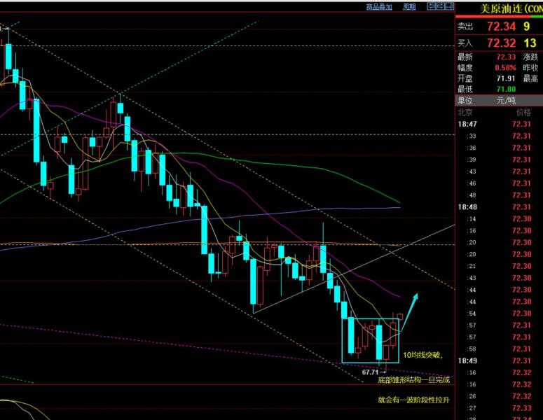 原油方面:昨日延续慢涨触及了底部雏形机构的压力位72关口, 10均线突破站上,短期弱势打压或结束,不过最好要突破有效站稳72上方,才能走出底部整理,向上阶段性展开一波拉升,会先测试大通道的上轨,冲破它,则可以波段持仓,图中美原油连已换月是2月份报价,对应1月份报价高大概0.3左右,自己注意下,所以1月份报价来讲,72关口还未有效站上,今日看收盘情况;