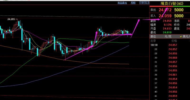 第二,白银方面:周初指出23.6日线5均线上看涨,最高触及24.2,逐步拉升中;
