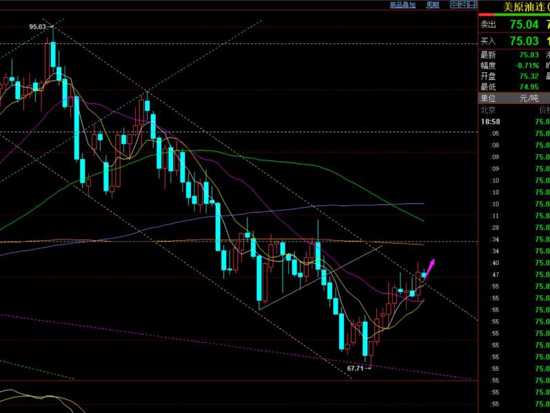 第三,原油方面:昨日先73上看涨,给到75-75.2日线通道上轨阻力时,还处于小时线大阳,并未丝毫承压,则继续看涨,最高触及76.2一线;