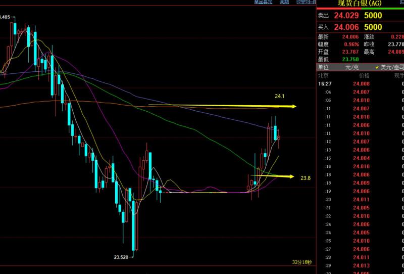 白银方面:短期支撑23.8,同样以今天低点作为风水岭,判断对错即可,看涨阻力目标留意24.1,站上了则进一步拉升前高;