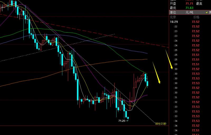第三,原油方面:短期承压向下,依托72.7下弱势看跌,符合预判,最低触及71.2;
