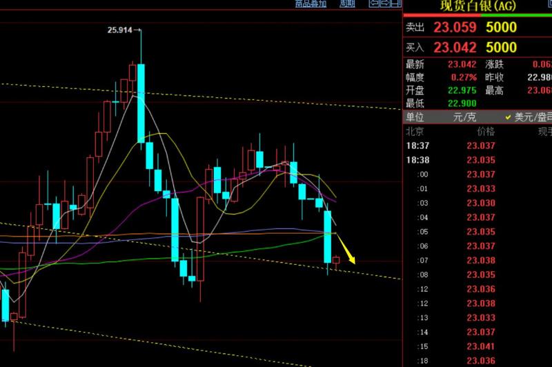 白银方面:日线大阴失守年均线和66日均线共振位置23.35,则短期转弱承压,今日23.35下方看跌,支撑22.85,往下是22.5前低,至于什么时候能企稳得留意形态,以及黄金的变化;