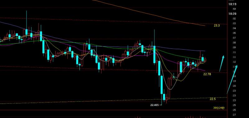 白银方面:日线级别也是重点关注什么时候收盘站上5均线,来作为结束短期下跌调整的信号; 日内小时线级别,图中阻力23.3,支撑22.78和22.5,依然是回测看涨为主;