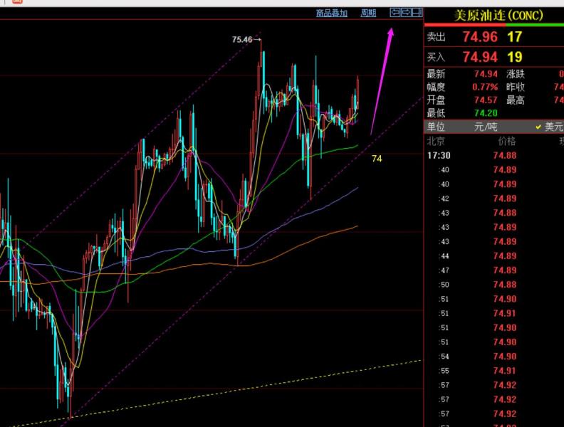 原油方面:日线依托短期均线逐步震荡拉升,维持上行通道内发展,今日下轨上移至74一线,今晚此位置上逢低继续看涨,阻力75.4前高和76.1;