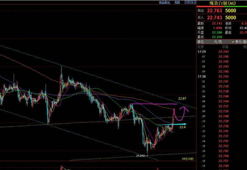 第二,白银方面:相对金价来讲,白银走势前期下跌力度过猛,基本差不多该结束了,21.8支撑也差一点到位,昨日22.4下承压给到22.2再进行反弹回到22.4;