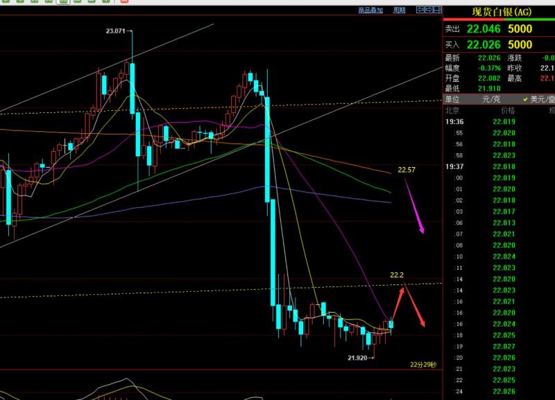 第二,白银方面: 美盘受消息刺激,跳水至经过22.67支撑也就不能按计划去执行,因为压根没企稳信号;