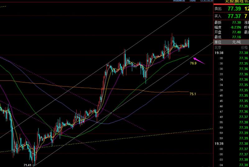 原油方面:今日关注图中通道下轨支撑76.9一线,也是日线5均线位置,此位置附近能稳住则继续看涨走高,阻力78.2周线中轨不变,看得失情况; 原油近期涨了则连续几日上攻,跌了也是连续下挫,所以还需谨慎它随时掉头;若失守76.9,下方还有一处重要支撑75.1逢低;