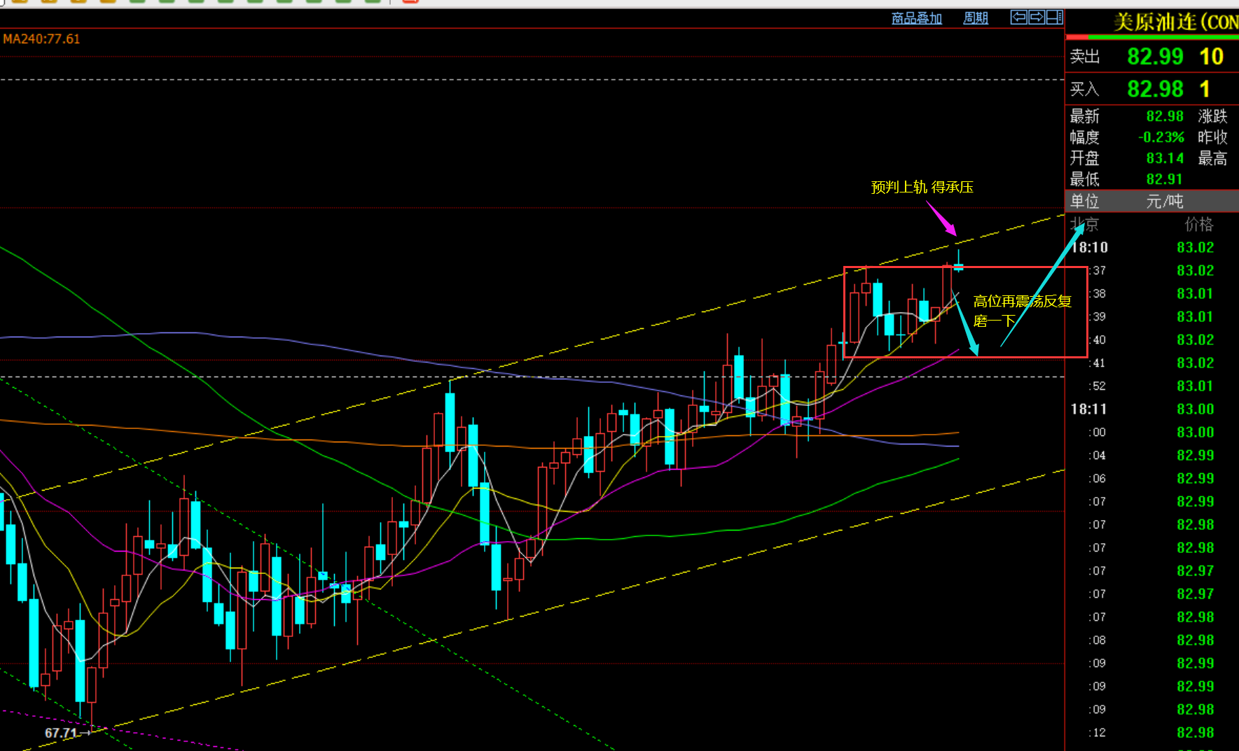 原油方面:日线通道上轨83.8-84一线预判还是会有阻力承压,而周线这几周是维持震荡逐步走高,5均线支撑81一线,依托81继续波段看涨;因此,本周短线有可能围绕84-81区间内进行高位整理,再伺机上破; 今日小时线级别出现顶部大阴,则83.6下有一定压力,支撑82.6,关注此区间得失,若失守82.6延续下跌,则会步入84-81内整理;