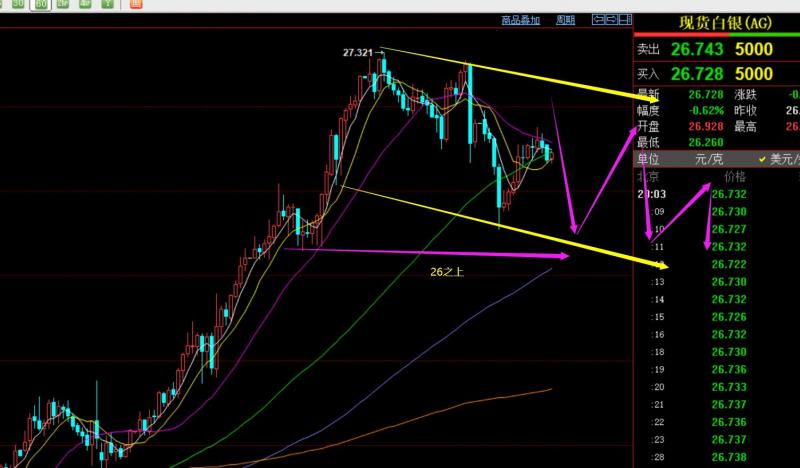 白银方面:从图中看,短期或也有所调整的需求,因为高点开始慢慢下移,今晚关注27-27.1阻力,支撑26.3-26,震荡对待;