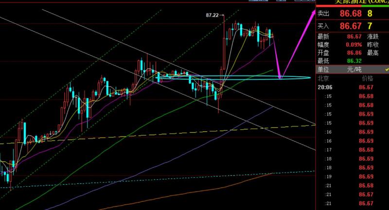 第三,原油方面:日线连阳单边逐步走高,突破5个月以来的通道上轨阻力后,确实来了一波单边,昨日研报提出,85和84.2两支撑,继续看涨,最终拉升抵达87关口,就是来的时间太晚了,后半夜,多数人也就不去参与了;