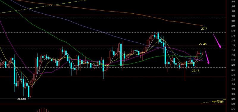 白银方面:从日线看,白银的弱势修正比黄金明显,上周五收报一根中阴K,10均线承压27.7下,日内分割承压27.45,这两处阻力位仍看压制跌,支撑27.15和26.7,区间过山车震荡对待;