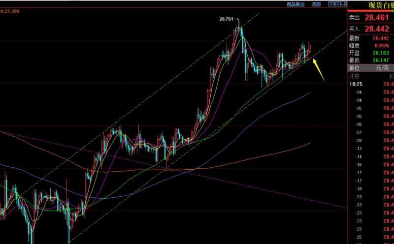 白银方面:如图所示,当前处于上升通道进行短期反弹,下轨支撑上移28.3一线,一旦此处失守,则意味着会出现一波下跌回调,阻力位28.5-28.7范围,仍保持压制震荡,向下应该会破位,而展开日线级别29-26大区间的整理;
