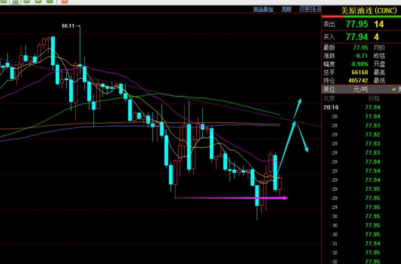 原油方面:欧盘拉高一波,美盘前回测,那么今晚还有二次上行概率,77.7一线属于日内反弹回测的618分割支撑点,还是这个价位,反复试探,反复看企稳拉升反弹,阻力目标78.3-78.7; 重点是78.7附近紫色趋势线反压点,昨日是79,只有突破站上它,才能扩大反弹力度;