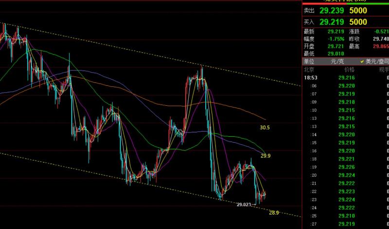 第二,白银方面:亚欧盘它的走势和黄金不同,黄金当时处于弱势,它却是一路慢涨走高,所以美盘前后出现急跌下探一般是诱空,还有二次拉高,从29.4涨是29.8就说明了;