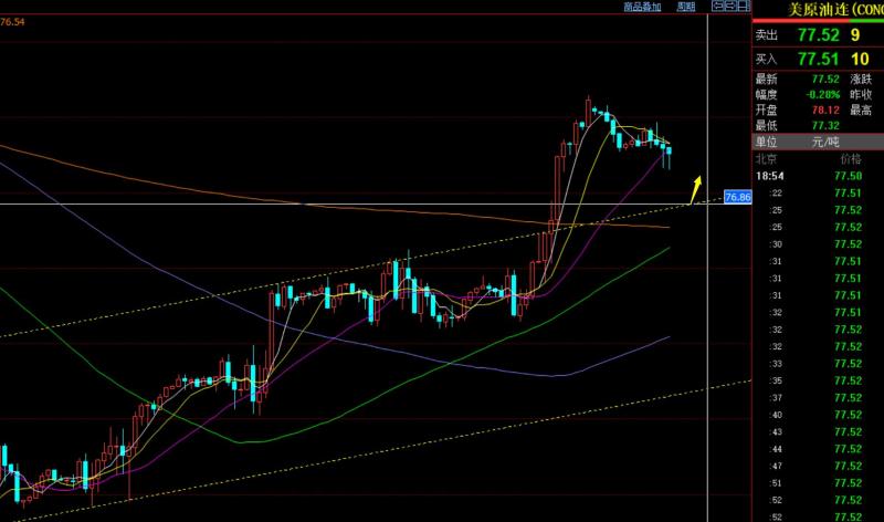 第三,原油方面:原本昨日提及的阻力是76.5一线,但价格触及后下滑空间不大,且两三次去试探,就不好阻挡;加上日线级别,突破了上周五阴线的高点,就担忧它会洗回去,也就未去试探空 ,继续看戏一日;