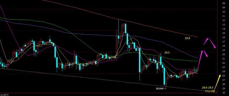 第二,白银方面:这几天白盘只要处于29下方,都容易先反弹一波,短线一般都有0.3-0.4利润空间;后半夜回测,打到了28.65,逐步逼近日线通道下轨强支撑28.5一线,就容易再度探底拉升;