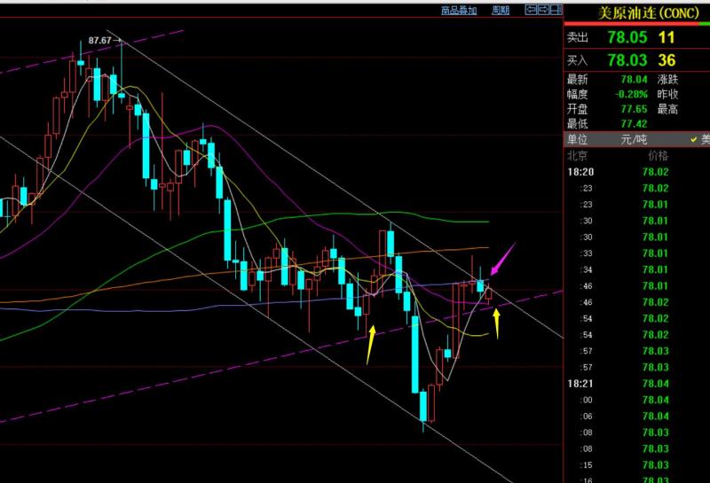 原油方面:一波持续拉升反弹后,这两天处于震荡选择,下方有通道回踩支撑,上方有趋势阻力压制,窄幅运行,收敛三角,可以选择今天观望,出一个明确大阳或大阴,有效上下破了,下周处再去选择跟随,是进一步大V拉升呢,还是压制二次探底;