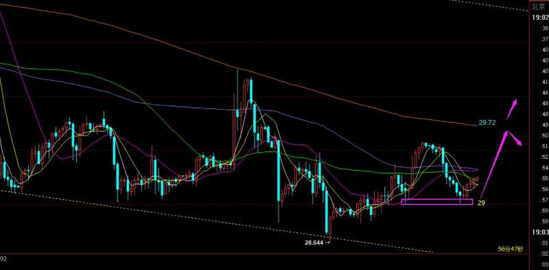 白银方面:周线支撑10均线29,承压5均线29.7一线,本周争夺短期这两均线,看收盘是向上突破还是向下突破来定下周以及后市的中期强弱; 日线级别,价格已经逐步逼近上涨通道的下轨支撑,今日上移28.7一线,此位置上随时会企稳,结束短期下跌调整,回归强势拉升;而日内小时线级别,29出现支撑,今晚依次作为拉升启动点,向上看反弹,目标阻力留意29.7一线,这里突破站上了,才能逐步走强,去冲击30.7或更高;因此,短线29上震荡看涨,波段28.7及下入场看涨;