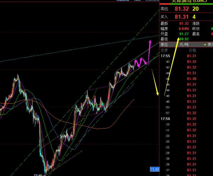 原油方面:周线这周应该是收报大阳,站上10均线和中轨,中期就再次打开拉升走高局面;那么对于下周及后市来讲,无非两个选择:一个是直接连阳,中期强势走高;一个是下周回测均线确认支撑后再走高;因此,对于图中的就是两条路线,紫色路线缓慢运行,然后直接走高,继续向上突破; 黄色路线是缓慢运行后,向下修正一波,再企稳反攻;结合日内震荡上行区间,就可以推断80.8上有下轨支撑,触及已开始有所上涨,阻力目标上轨关注81.8-82,然后看它得失情况,继续保持看涨为主;