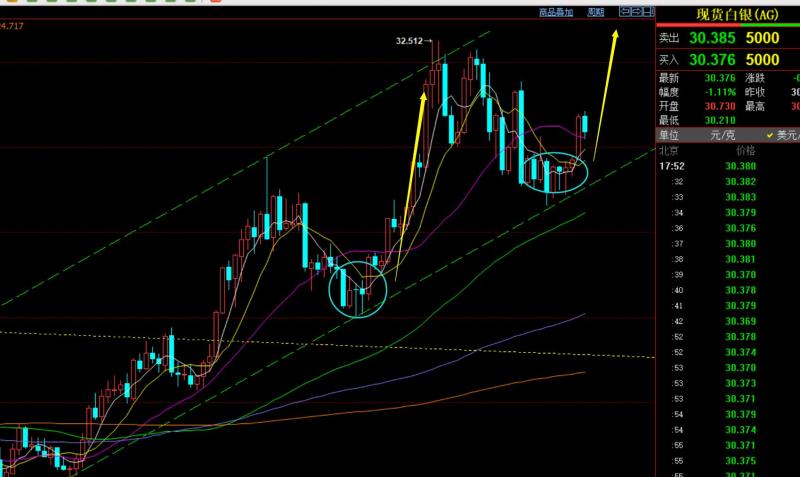 第二,白银方面:昨日30.2顶底转换点提示继续看涨,抵达30.53通道阻力目标,且冲破后,最高拉升至30.8;