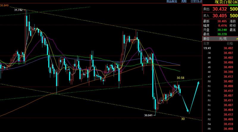 第二,白银方面:昨日它比较弱,30.83看涨,也只有拉升0.2空间,随后回落跌破通道下轨支撑30.55;不过,好在新通道的下轨支撑30.1守住了,今日再次反弹确认了通道反压点30.58一线;