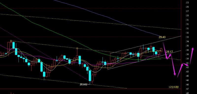 白银方面:日线同样是大跌之后的震荡反弹修正,整体力度也不大,短期均线暂时压制为主,不过白银大通道的下轨支撑在28.2-28,再砸盘下滑的空间也不大了,一旦触及可以计划抄底; 短线而言,根据图中通道,今晚阻力29.43一线,支撑29.17一线,预计也容易冲高回落,拉升空间不会太大,出现刺破阻力也会在29.65下进行压制回落;
