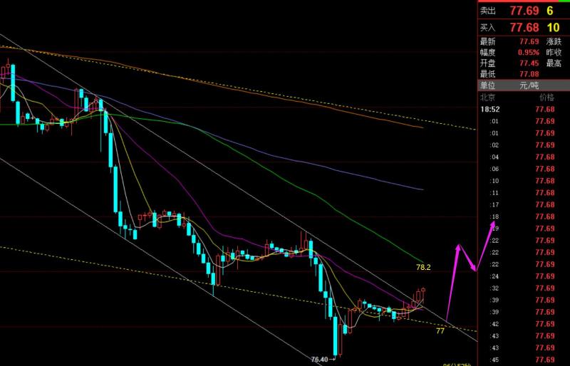 第三,原油方面:昨日再次依托通道下轨77.4尝试看涨反弹,结果后半夜下穿了,但尾盘又回升了,属于小洗盘;