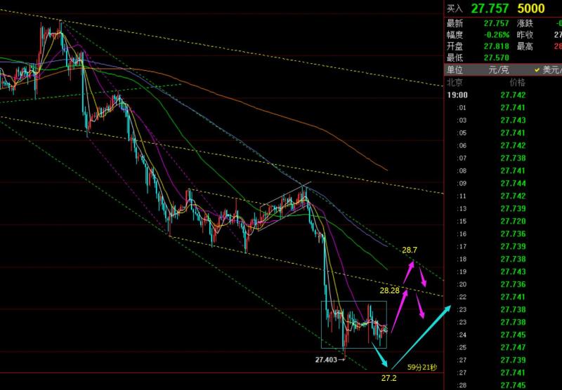 第二,白银方面:昨日依托下行通道下轨支撑附近,给出27.4之上看涨反弹,最终拉升一波至27.9,也成功一波;