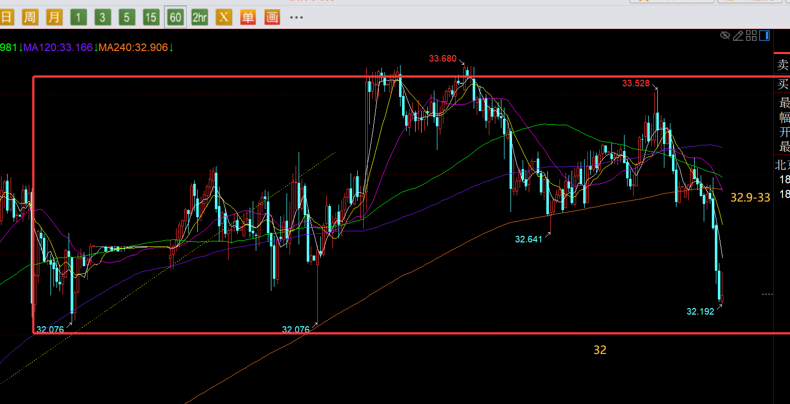 白银方面:白银目前也是维持箱体整理,关键支撑32,今日下破了小时线年均线,那么32.9-33下会成为反压,留意此区间内震荡对待;