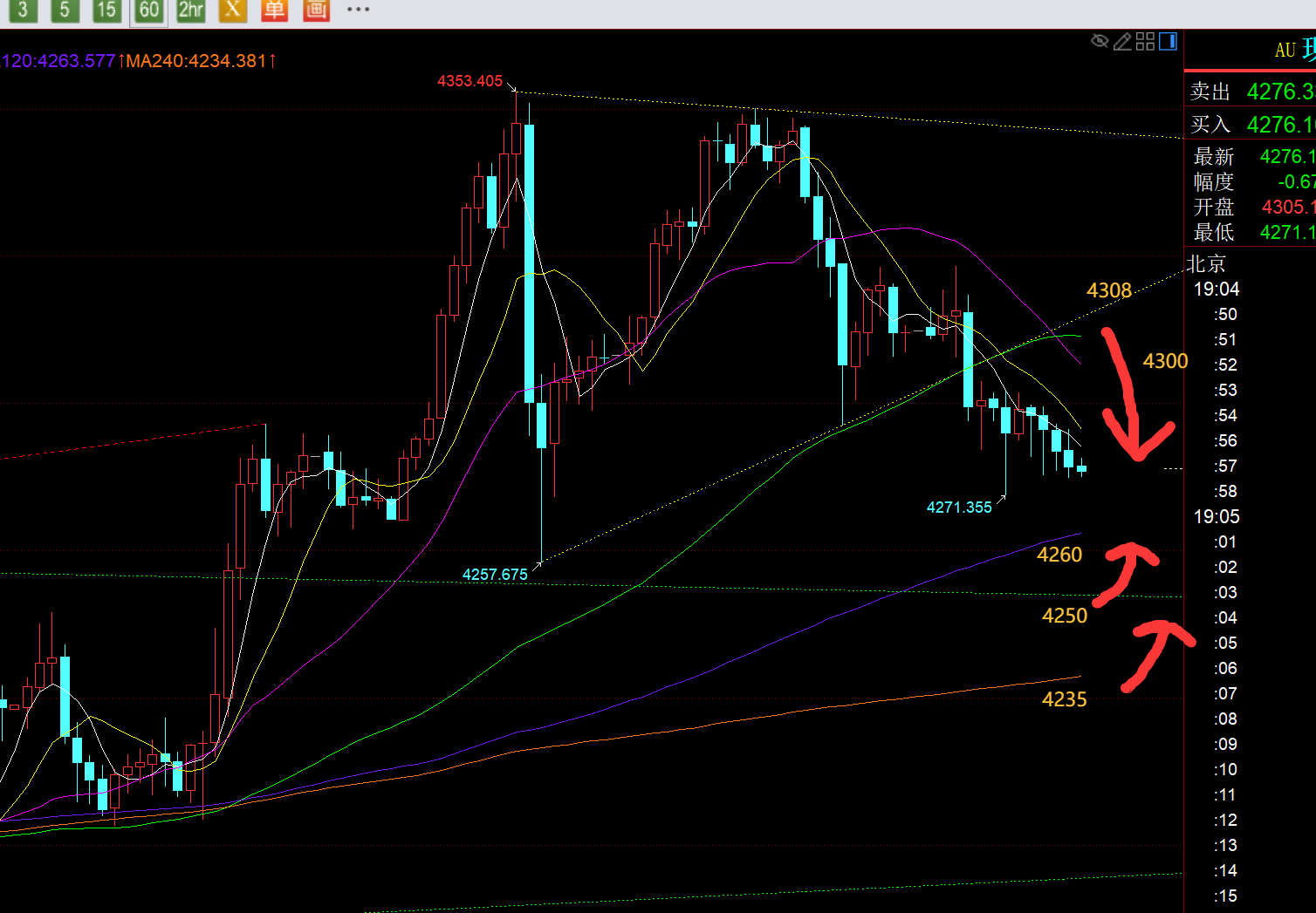 第四,黄金小时线级别:上周五收盘前,穆迪宣布下调美国评级,也是最后一个AAA,意味着加重了美债危机,信用度降低,投资者会把目光放在其他避险产品中,黄金就自然首当其冲;美股开始高位下滑,也带动部分资金加入黄金;另外还有中东局势仍在升温发酵,俄乌谈判结果并不理想,这几个都会有利于金价的企稳拉升;因此,今日开盘直接跳空拉升至3250一线;午后一波回踩确认3210,欧盘企稳继续震荡走高,技术上今日走的是比较完美的;那么一旦美盘前价格处于日内高点或突破高点,都会给美盘带来二次延续拉升动能,上方就可以指向3265前一处高点,以及年均线3280一线; 午后稳定3210一线,低点逐步上移,目前最近支撑则是3233,两次触及都是探底长下影K,今晚破高的概率是比较大; 倾向于3233作为支撑防守,继续震荡看涨走高至3265、3280,甚至3300更高; 反之,若失守3233,则可能再次转为来回震荡运行,那样就容易不延续;