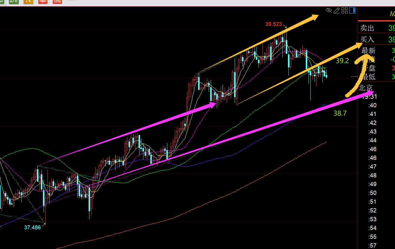 白银方面:日线级别,白银还保持良好的强势上涨形态,尽量仍回踩看涨为主; 今晚黄色紫色通道下轨38.7支撑上企稳看涨,阻力39.2,突破站上才能回到黄色上行通道之内;
