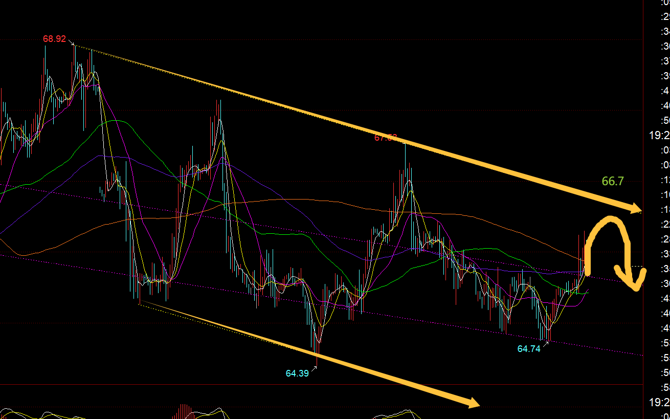 原油方面: 前几日一直提示指标底背离状态,会出现超跌反弹,一直磨到今日才迎来一波拉升;不过今晚要关注黄色通道上轨66.7之下,承压看压制回落,修复完背离之后,就要回归压制状态;