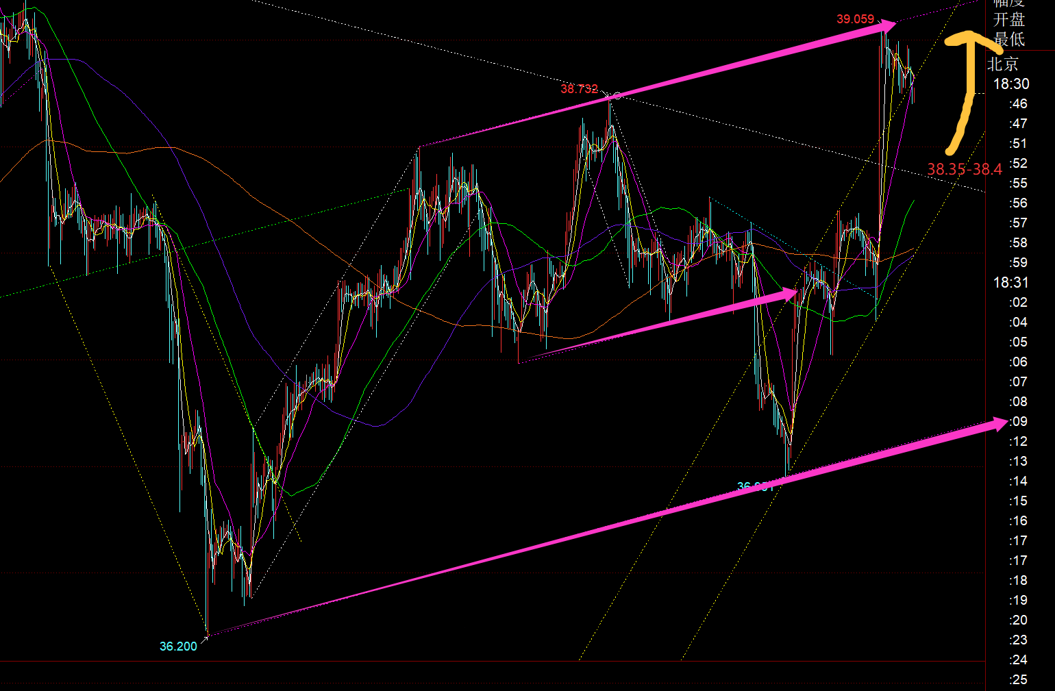 白银方面:周线和日线都是收报不错的大阳K,本周继续维持看涨为主;日线级别大阳收盘刚处于其中一个通道上轨位置,39.1一线是存在一定阻力,不宜直接追涨;从图中看,回踩重点关注的支撑是顶底位置38.4-38.35,靠近日线5均线,和50分割位置;这几日白银每次启动上拉之前,总容易出现一波诱空小急跌,一旦再出现此信号,就基本是日内相对低位;