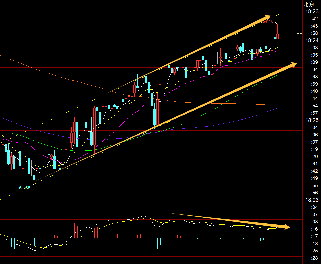 原油方面:这几日慢悠悠的震荡一路上行,日线站上10均线,短期是是处于一波反弹中,也可能是之前反复提及的超跌反弹;只是小时线级别,macd长时间的顶背离,还是会有所担心冲高回落一波,都不太好出手,稳妥就是等修复macd至零轴之下,再去介入企稳反弹,支撑63一线;