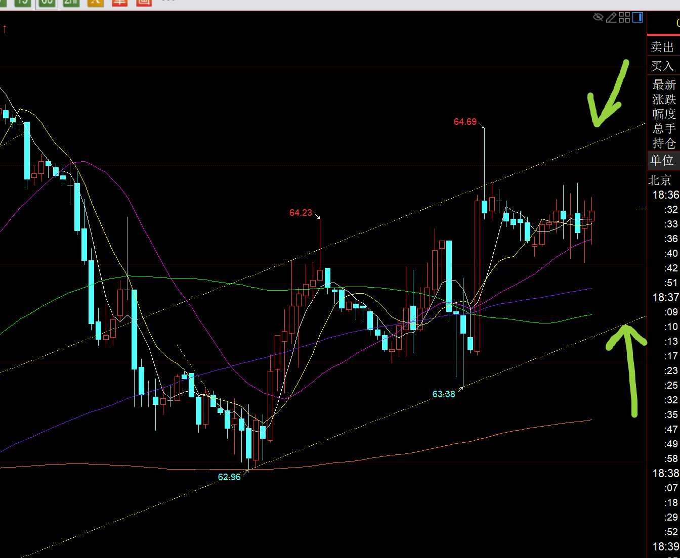 原油方面:日线级别就继续关注日线和10均线哪边有效突破的问题,届时进行跟随;而图中小时线级别,有一个上行通道可以关注下,上轨64.6,下轨63.7,区间幅度不大,靠边再看信号;