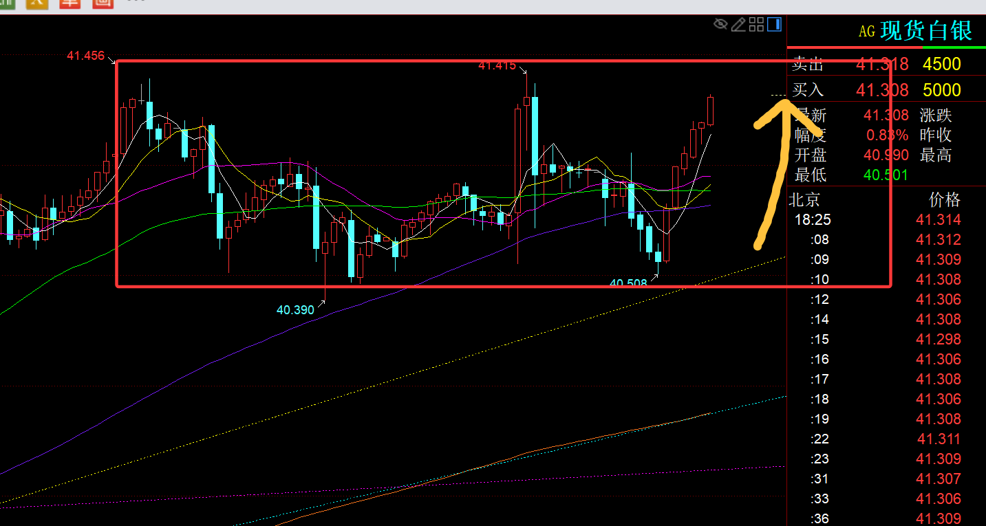 白银方面:周视频解读过,黄金处于单边延续拉升,而白银这几日处于高位区间整理,但也是依托整理的下轨支撑继续反复看涨为主;今日早间指出40.6-40.4继续看涨,符合一波拉升,目前又再次逼近41.4上轨;今晚若回踩40.6之上继续看涨,或40.8、40.6分批进行,一旦突破站稳41.4,或指向42-42.2;