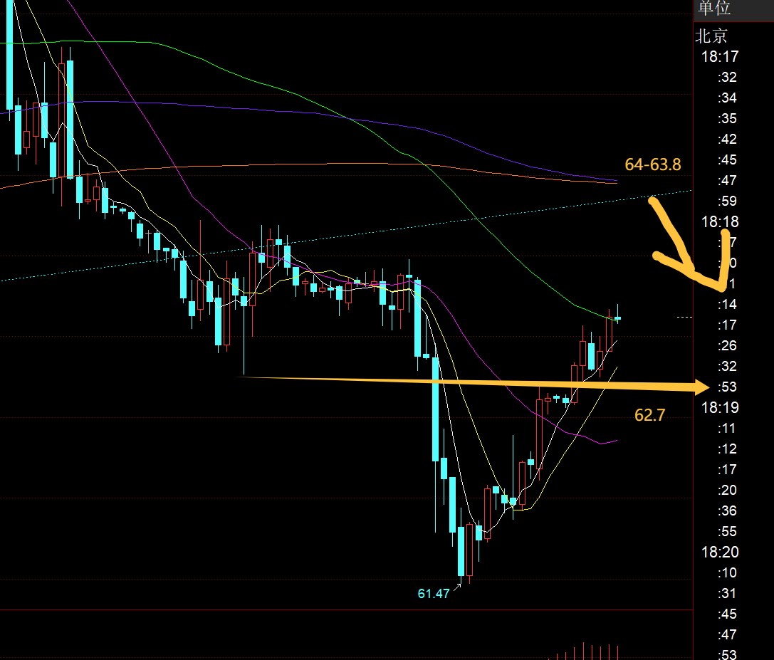 原油方面:看,原油果然就是喜欢震荡来回跑,看着弱势持续下跌,但今日又出现的一波拉升,突破顶底阻力62.7,那么今晚可能要测试64-63.8通道反压点,再看是否压制回测;与其看着反复不定的原油,还不如一门心思盯着单边趋势的金银,趋势比震荡容易把握很多,只要一个方向不停的坚持干就行,偶尔遇到短线跳水会洗一下,但整体拿下的利润肯定是大头;