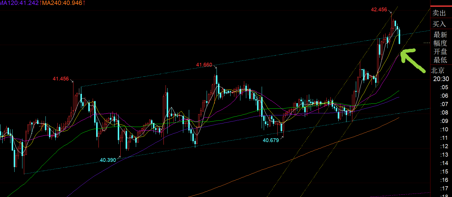 第二,白银方面:这周白银是最靓的仔,一路提示40.4、40.5、40.6、40.7-40.8上坚持看涨,低点逐步上移,今日爆发了,冲击42美元的上方;
