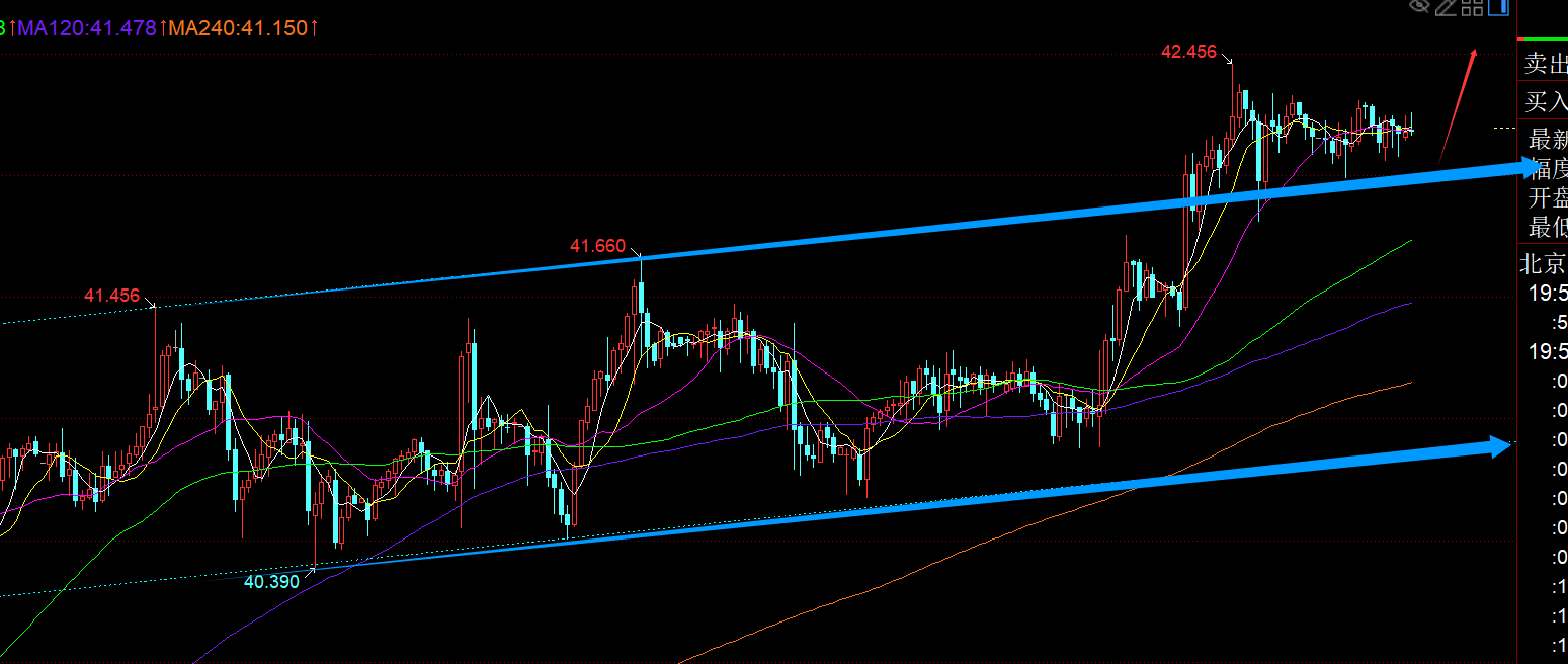 白银方面:从上图看,它是处于突破蓝色通道之后的高位整理,只要守住上轨41.95之上,就继续维持强势看涨不变,目标去冲破42.45刷近期高点;