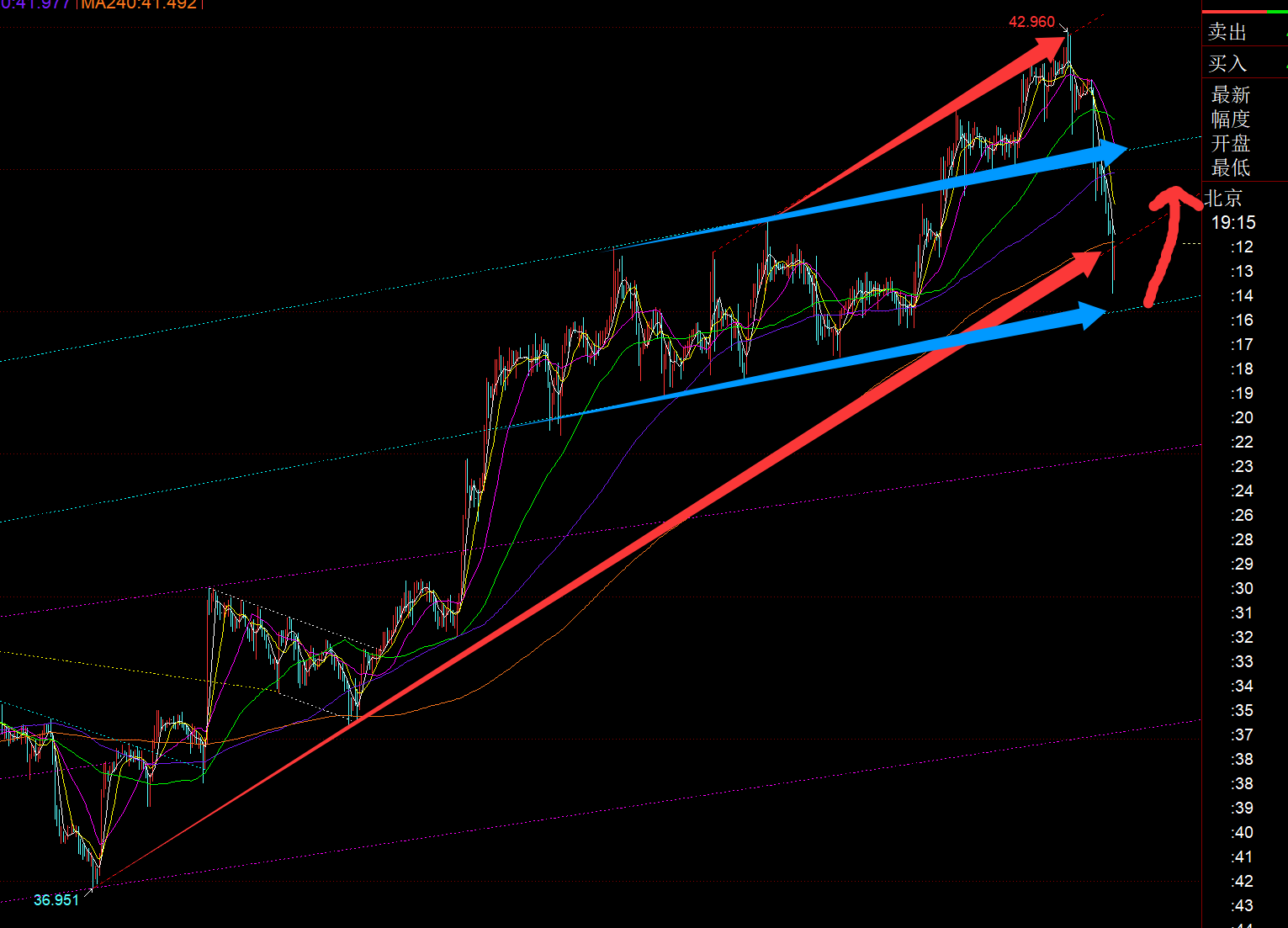 白银方面: 今日它出现下跌力度比黄金更大,日线大阴都刺穿了10均线支撑41.5, 那么它提前走预期的概率就更大;今夜宣布降息之后,就谨慎追跌,也是耐心等企稳看涨,抓波段低位;参考几个位置,一个是图中蓝色通道下轨支撑41附近,一个是周线5均线,日线通道回踩确认点,和中轨支撑,集中40.6-40.2范围,刚好也是上周一路震荡上扬每次的起涨点,在往下暂时看不到;触及它们出企稳信号,则继续尝试看涨,单边拉升过程中,出现阴线只是修正,为后期进一步拉高做铺垫,今晚短期阻力42.1,开跌口42.6,也是两个;