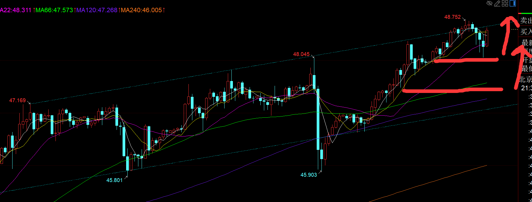 白银方面:白天突破了图中蓝色通道上轨,但可惜并未直接站稳,向下回踩了一波,刺破了中轨支撑,此时又阳线拉升,那么中轨位置依然支撑有效,今晚关注48支撑,再往下极限是日线5均线47.5-47.4支撑,都是选择企稳继续看涨,阻力目标本周初往49.7前高去看;