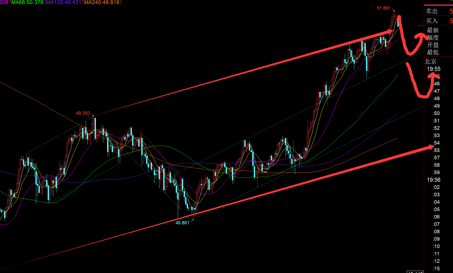 第二,白银方面:白银这两日走势明显强于黄金,日线大阳突破站上中轨后,直接持续连阳,快速打出了预期次高点51至少的高度,再往上就是52.5下一个高度可能会试探;但也要留意它的日线中轨也并未回踩修正,这为后市埋伏一定的伏笔;