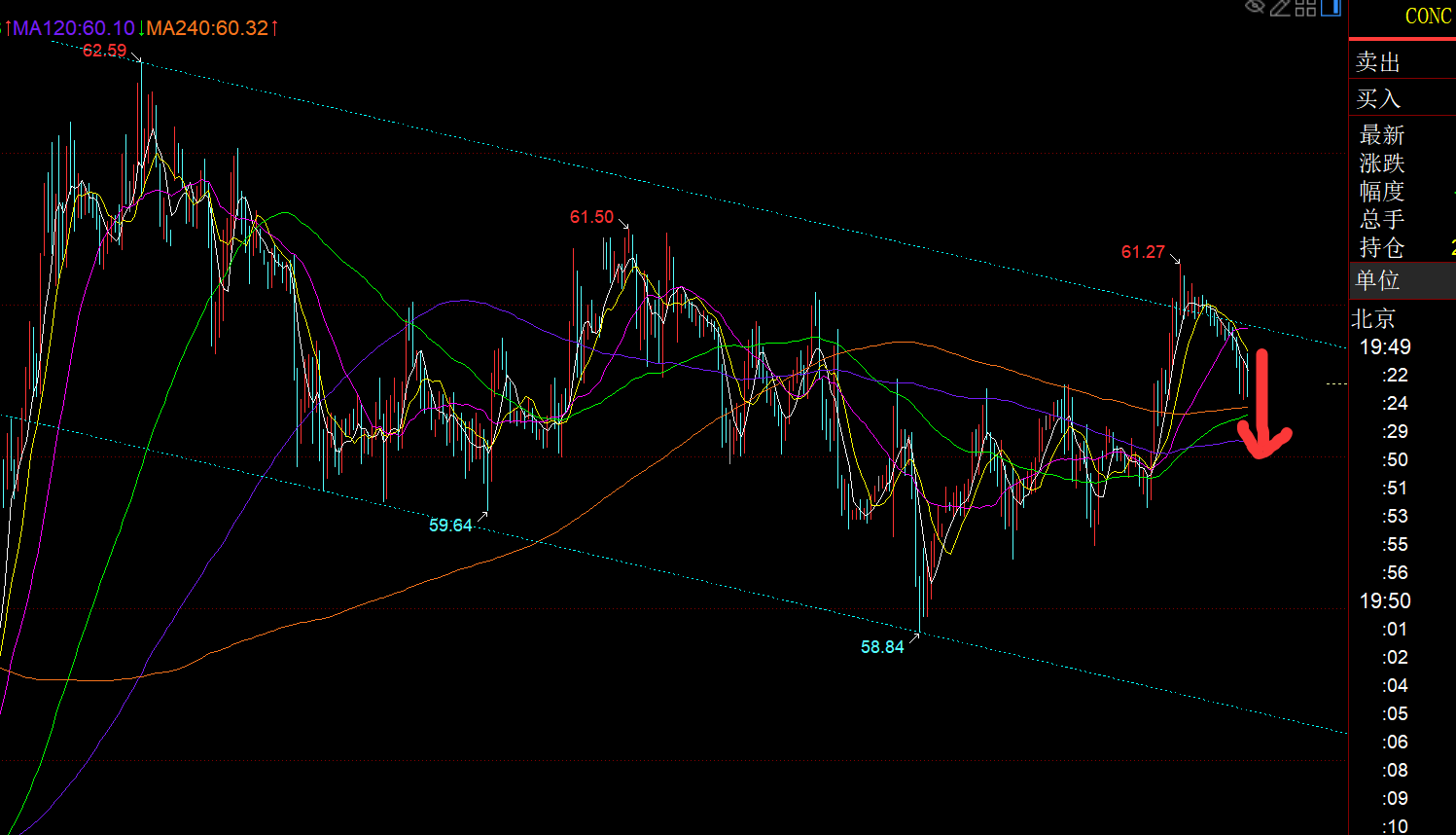原油方面:它就是按震荡对待,空间也比较小,走的比较缓慢,通道上轨承压回落,今晚关注60.2支撑,失守则留意59.8-59.6,再下去就会打开空间,逐步指向下轨;