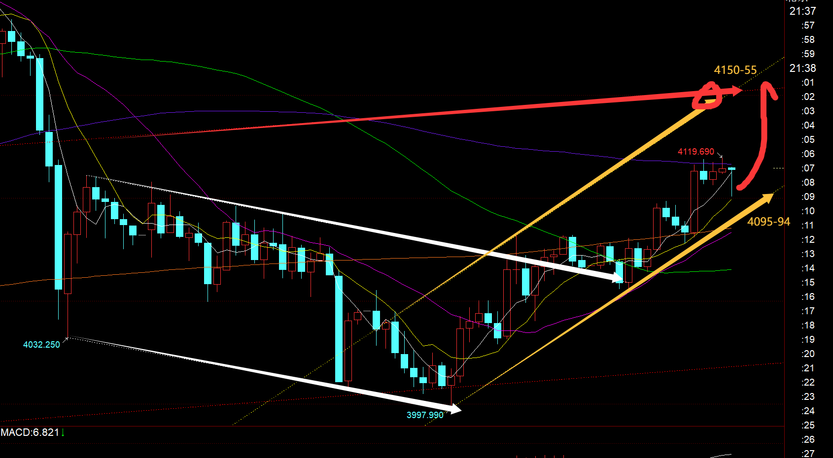 第三,黄金小时线级别:从上图通道分布看,隔夜收盘前已经突破站上了白色通道上轨,弱势格局也就结束,今日早间回踩确认上轨支撑大概是4060一线,而它也做了一次小刺穿假象,最低4055.5,稳住拉升后,就一路震荡上攻,每次出大阳,紧接着就是震荡回踩,再企稳继续出大阳;可以发现,每次回踩的低点都是前一波拉升的618分割处,4060、4078都是,所以它们都是看涨点,技术上也走的比较规范;欧盘拉升破高,今晚还有二次上涨,最后一波回踩618分割位置是4095-94,刚好也可以对应黄色通道下轨,触及继续看涨(当然,也可能回踩不到,那样只能说明它反弹力度加强了),阻力先留意4120-21,其次是4150,这两个位置是4244-3997的50 和618分割点,尤其重点关注4150,也是前期红色通道上轨,首次触及应该有些承压回落,毕竟是震荡期;但二次试探,三次试探去突破的话,就有望指向日线收敛三角上轨,接近4200-4190范围;