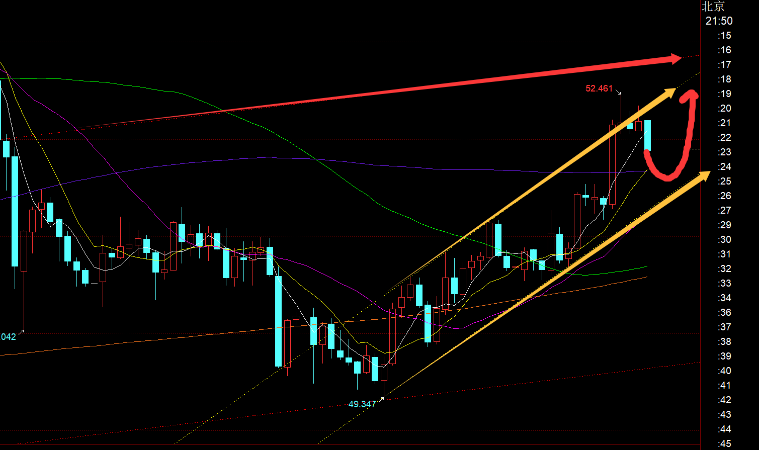 第二,白银方面:周视频指出,只要守住49.35一线,依托49.7上可尝试看日线第五轮拉升,短线虽有些发生刺穿假象,但整体方向上正确,的确迎来一波持续拉升,也坚守住了49.35;