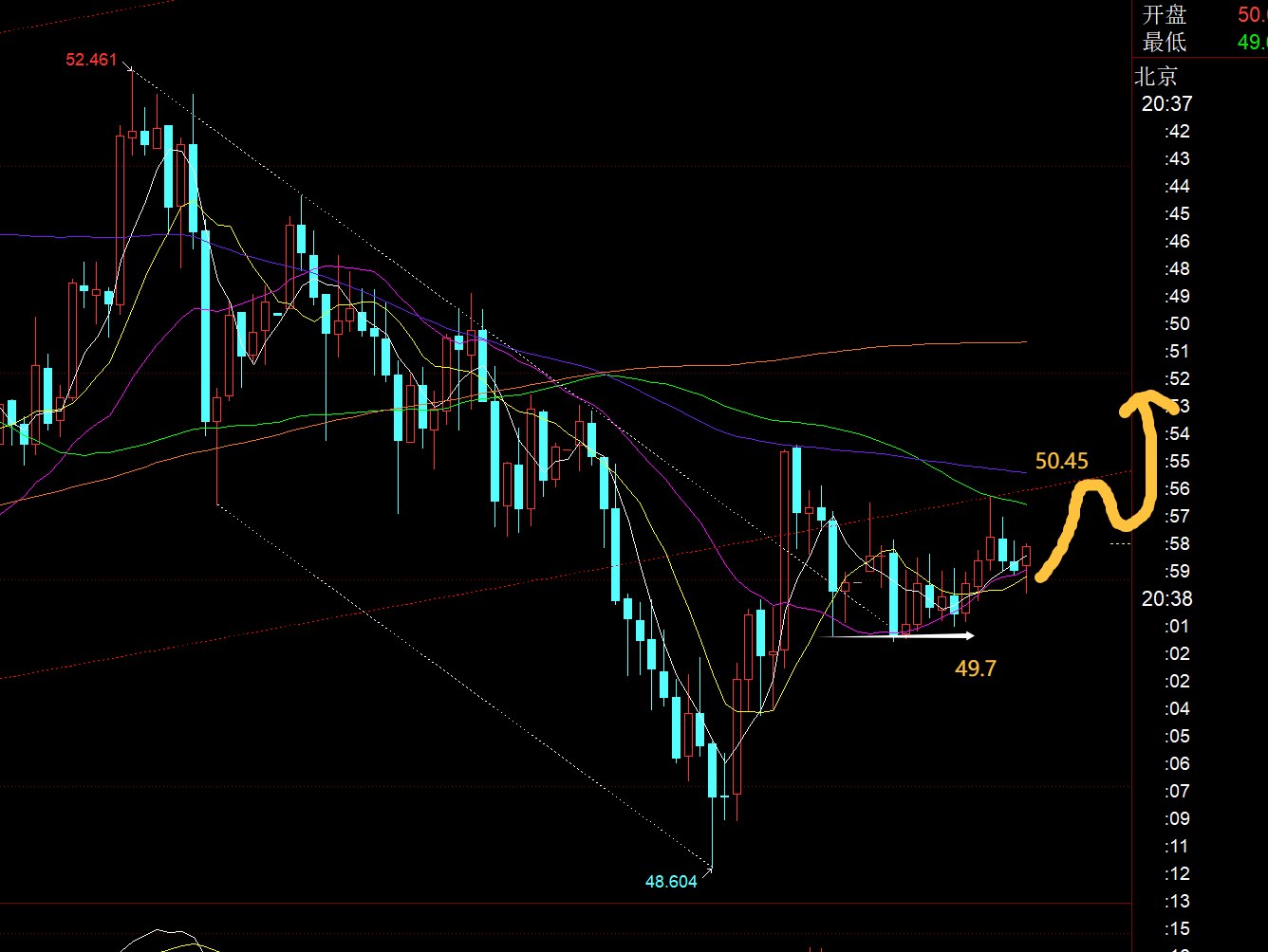 白银方面:周线短期均线5日和10日同样继续支撑中期走高,日线上周五收报较长下影K,插针式企稳,本周也倾向于震荡反弹拉升;从上图小时线级别看,中轨一直死撑,且向上反弹走出小范围收敛三角,则今晚依托49.9上继续看涨反弹,阻力50.45红色通道反压,一旦重新突破站稳,则会逐步拉升,打开更大空间;